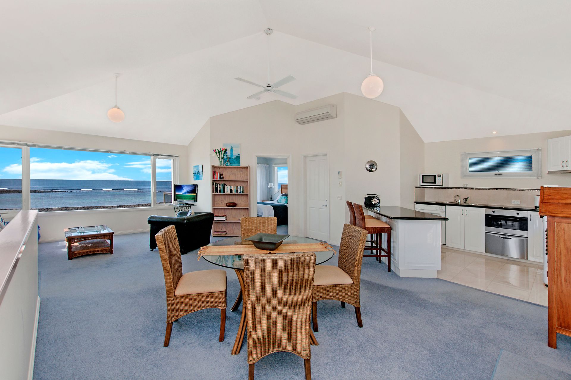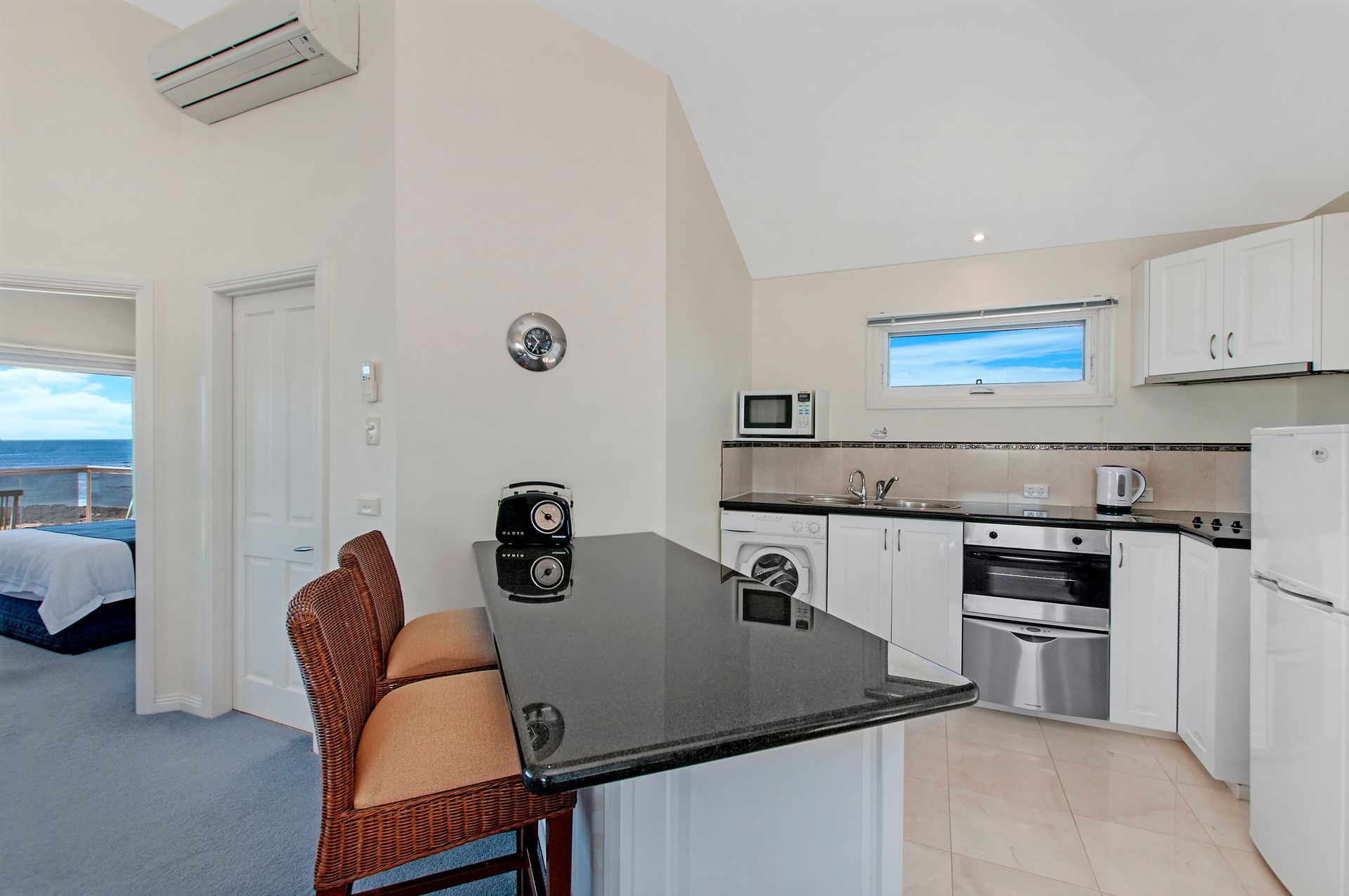 This One Bedroom fully self-contained apartment is ideal for a couples or singles getaway. This property allows you to enjoy the vast views of the Southern Ocean from the well-appointed living area or even from the comfort of the bedroom. As you walk up the long entry staircase you are instantly greeted by those breathtaking Southern Ocean-views from the open plan kitchen / living / dining area. Equipped with full kitchen facilities inclusive to oven, stove, washing machine and more. There is also a centrally located bathroom with shower and toilet - this property may be small but it is sure to be well equipped for you and your guest! WIFI is also available.