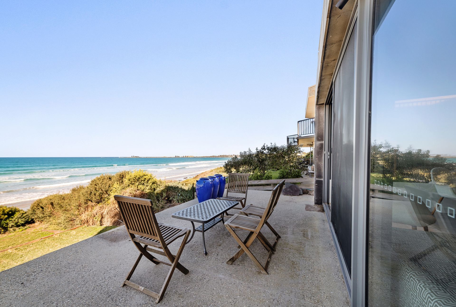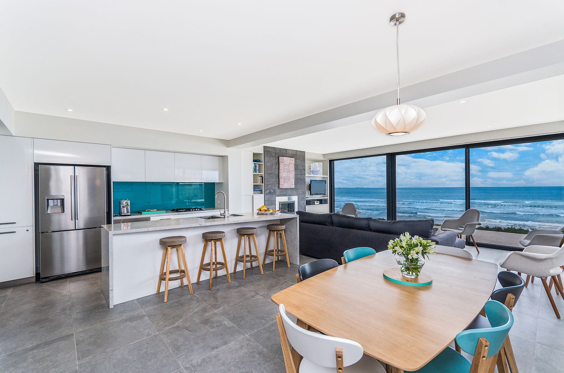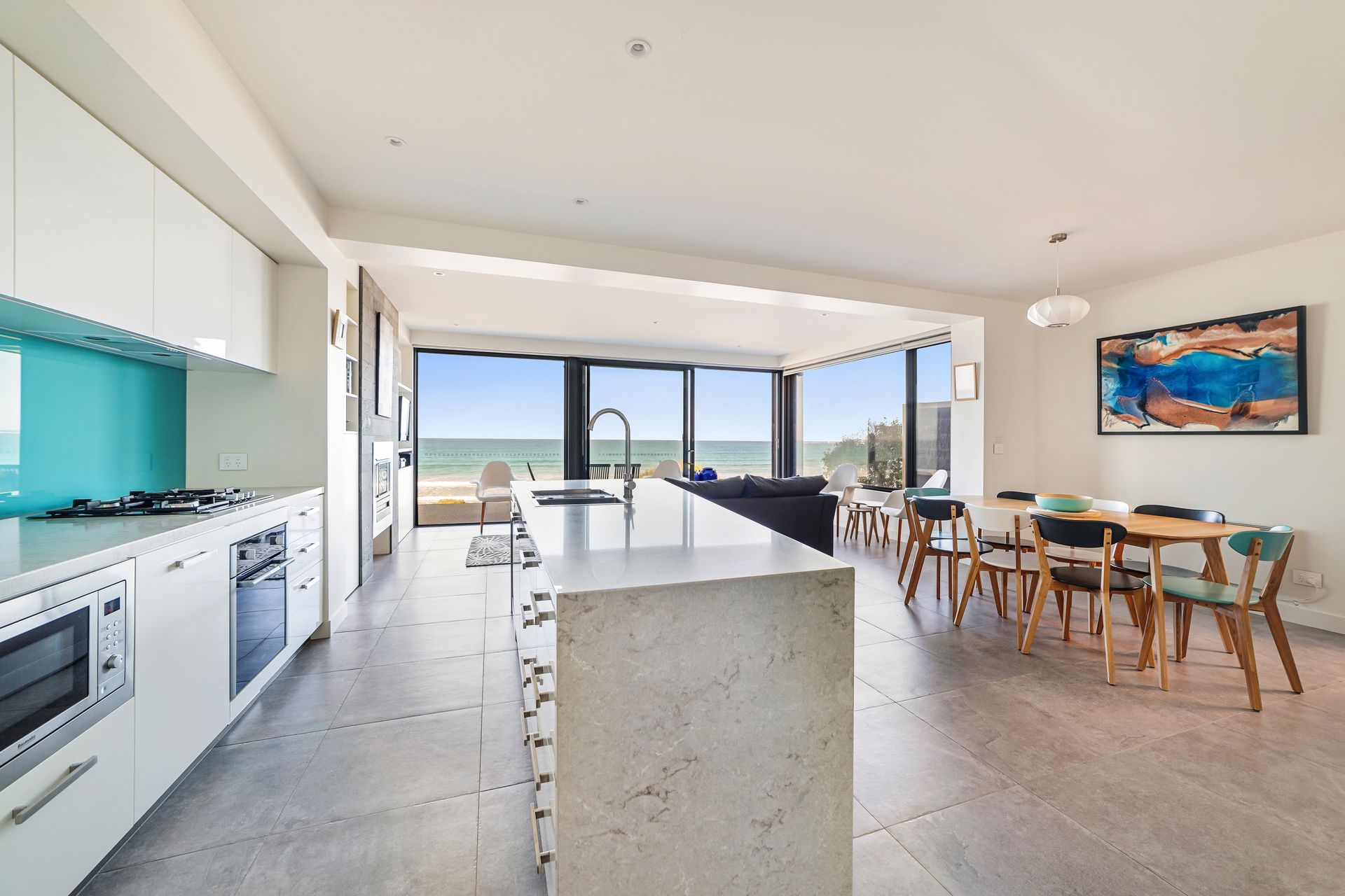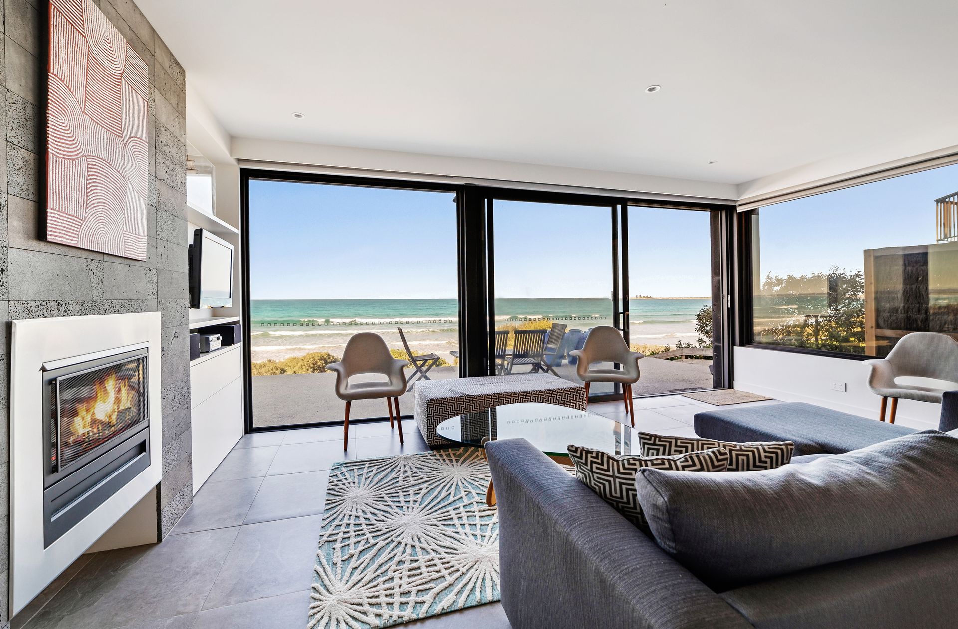 Aqua Mist is a luxurious, ultra-modern property boasting floor to ceiling ocean-views throughout. With stylish new furnishings, spacious living areas and multiple ocean-view balconies, this home is perfect for groups and families alike! When you walk through the front door into the foyer area, you will intriguingly walk to the first ‘studio style’ level. With expansive spaces, this studio style level is equipped with full size state-of-the-art kitchen facilities, laundry and separate Master Bedroom equipped with ensuite and robe. With direct beach access from your open plan living area through floor to ceiling bi-fold doors, this luxurious studio is like a special adult retreat for your group or family. Upstairs also features all the same qualities with a kitchenette / living / dining + laundering facilities, along with 2 spacious bedrooms equipped with King/ King single and a Queen Bed and 3 bathrooms and a powder room. If you're looking for a spacious, coastal getaway boasting modern clean lines, spacious bedrooms and in the most ideal location, then this beautiful house is for you! This property can accommodate 6 guests comfortably as per advertised rates.