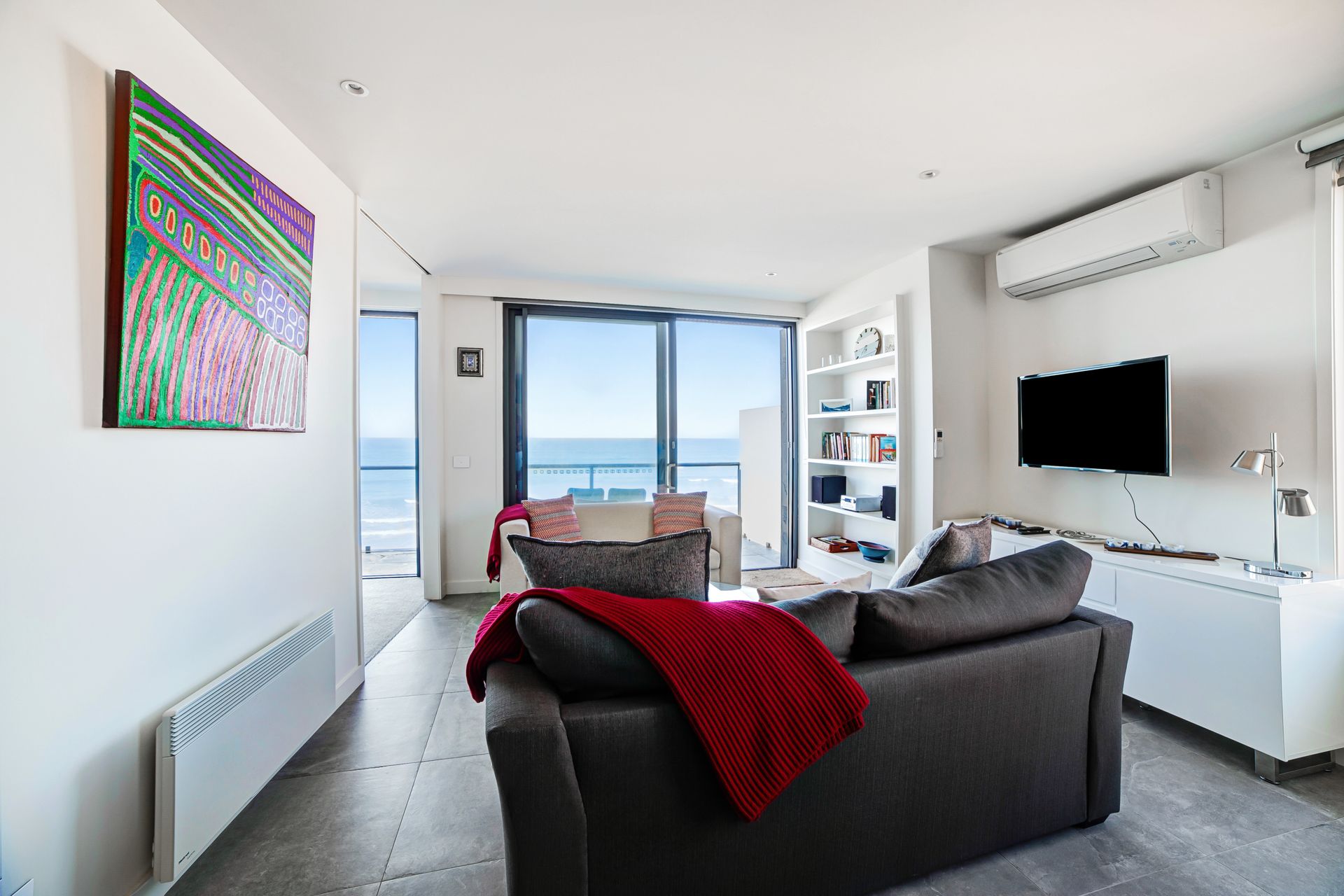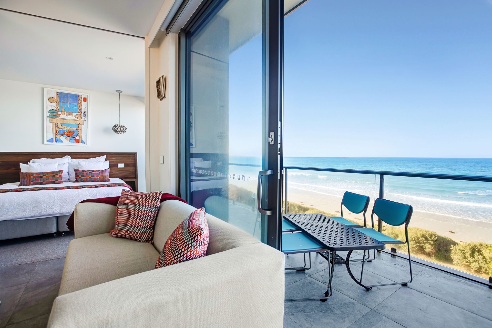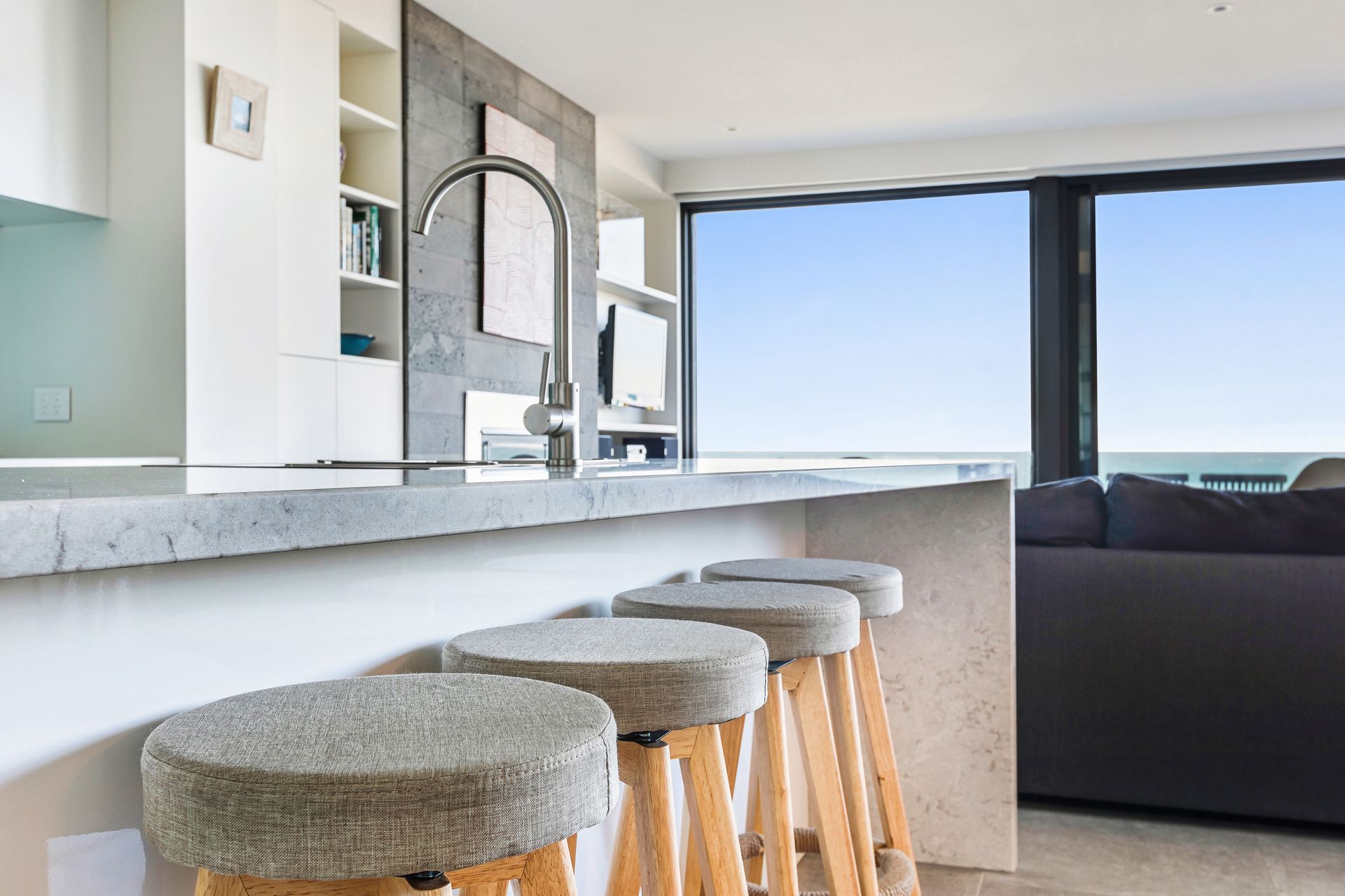Aqua Mist is a luxurious, ultra-modern property boasting floor to ceiling ocean-views throughout. With stylish new furnishings, spacious living areas and multiple ocean-view balconies, this home is perfect for groups and families alike! When you walk through the front door into the foyer area, you will intriguingly walk to the first ‘studio style’ level. With expansive spaces, this studio style level is equipped with full size state-of-the-art kitchen facilities, laundry and separate Master Bedroom equipped with ensuite and robe. With direct beach access from your open plan living area through floor to ceiling bi-fold doors, this luxurious studio is like a special adult retreat for your group or family. Upstairs also features all the same qualities with a kitchenette / living / dining + laundering facilities, along with 2 spacious bedrooms equipped with King/ King single and a Queen Bed and 3 bathrooms and a powder room. If you're looking for a spacious, coastal getaway boasting modern clean lines, spacious bedrooms and in the most ideal location, then this beautiful house is for you! This property can accommodate 6 guests comfortably as per advertised rates.