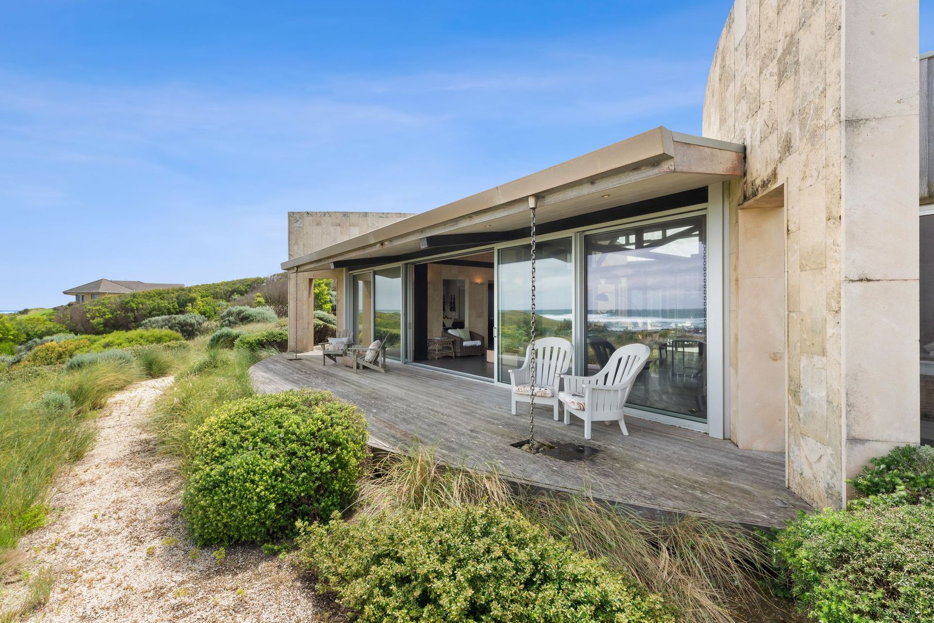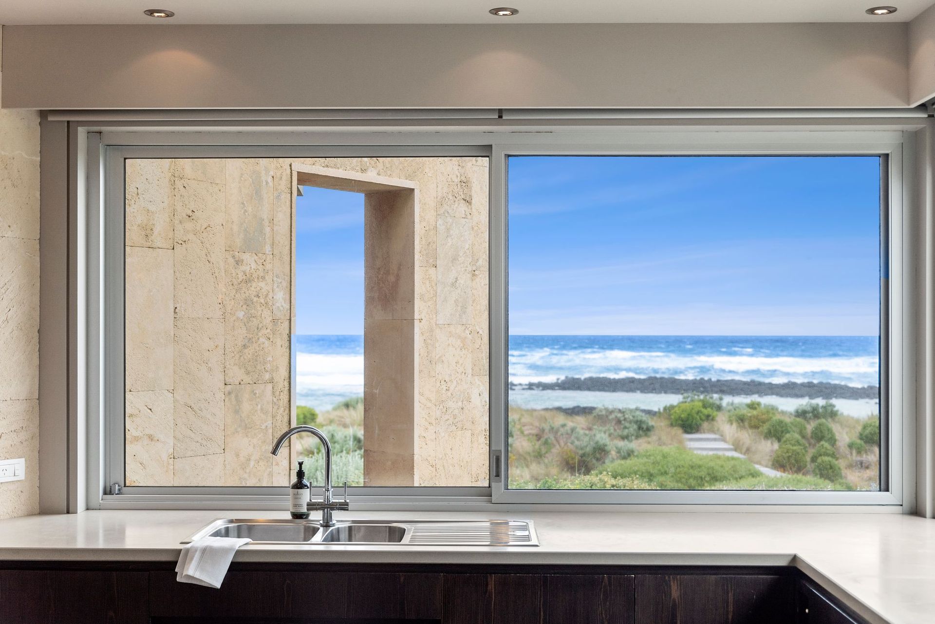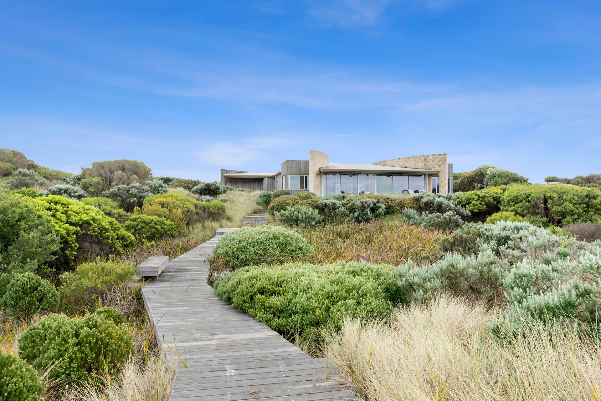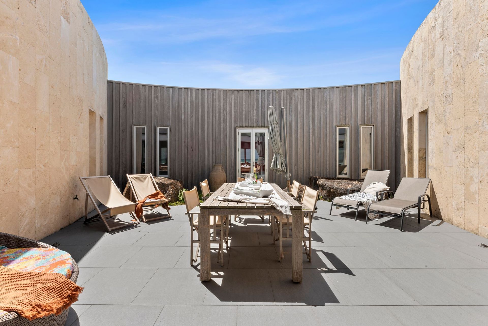 The unique design envelops a sun-drenched central courtyard and curved entertaining deck, perfectly placed to showcase the sweeping Southern Ocean vista. The dynamic scene can also be viewed from the primary living zone, the contemporary kitchen and the grand master suite, and celebrates the region's rugged beauty. Enjoy direct beach access via a private boardwalk meandering through the native garden to the shoreline.