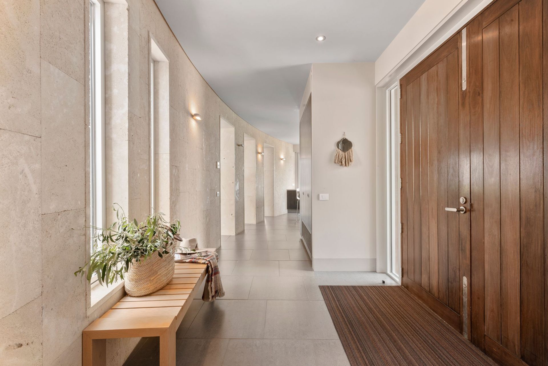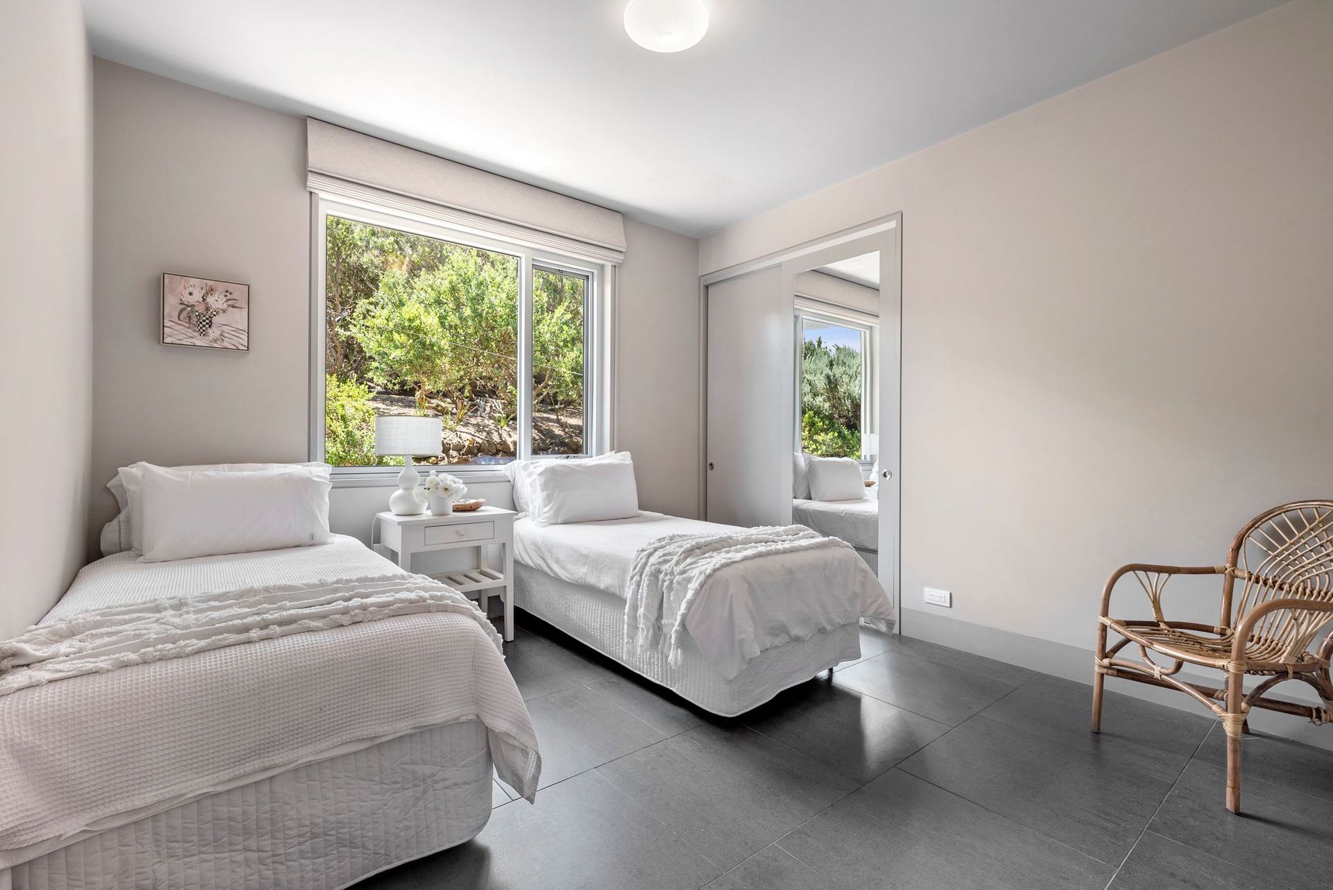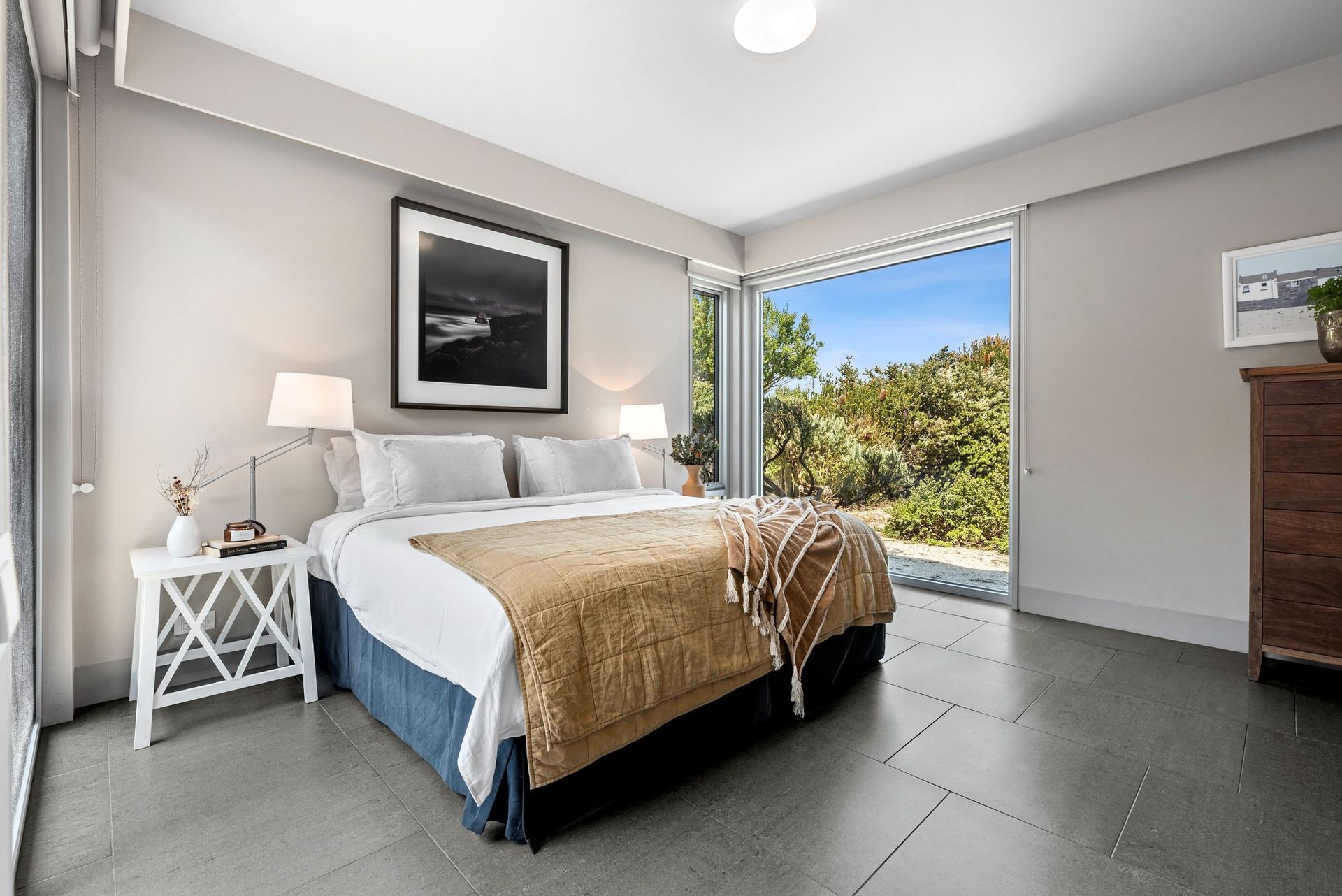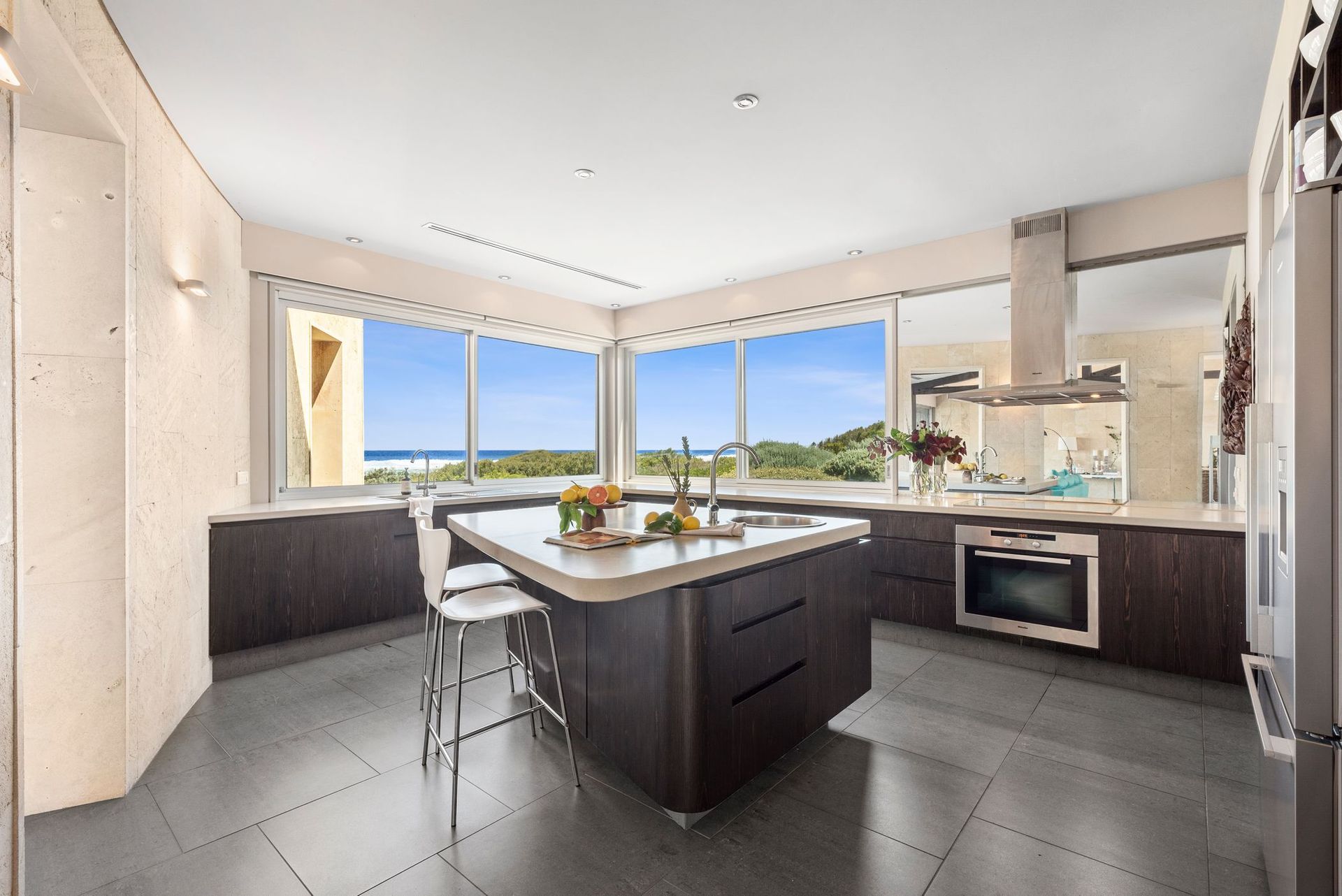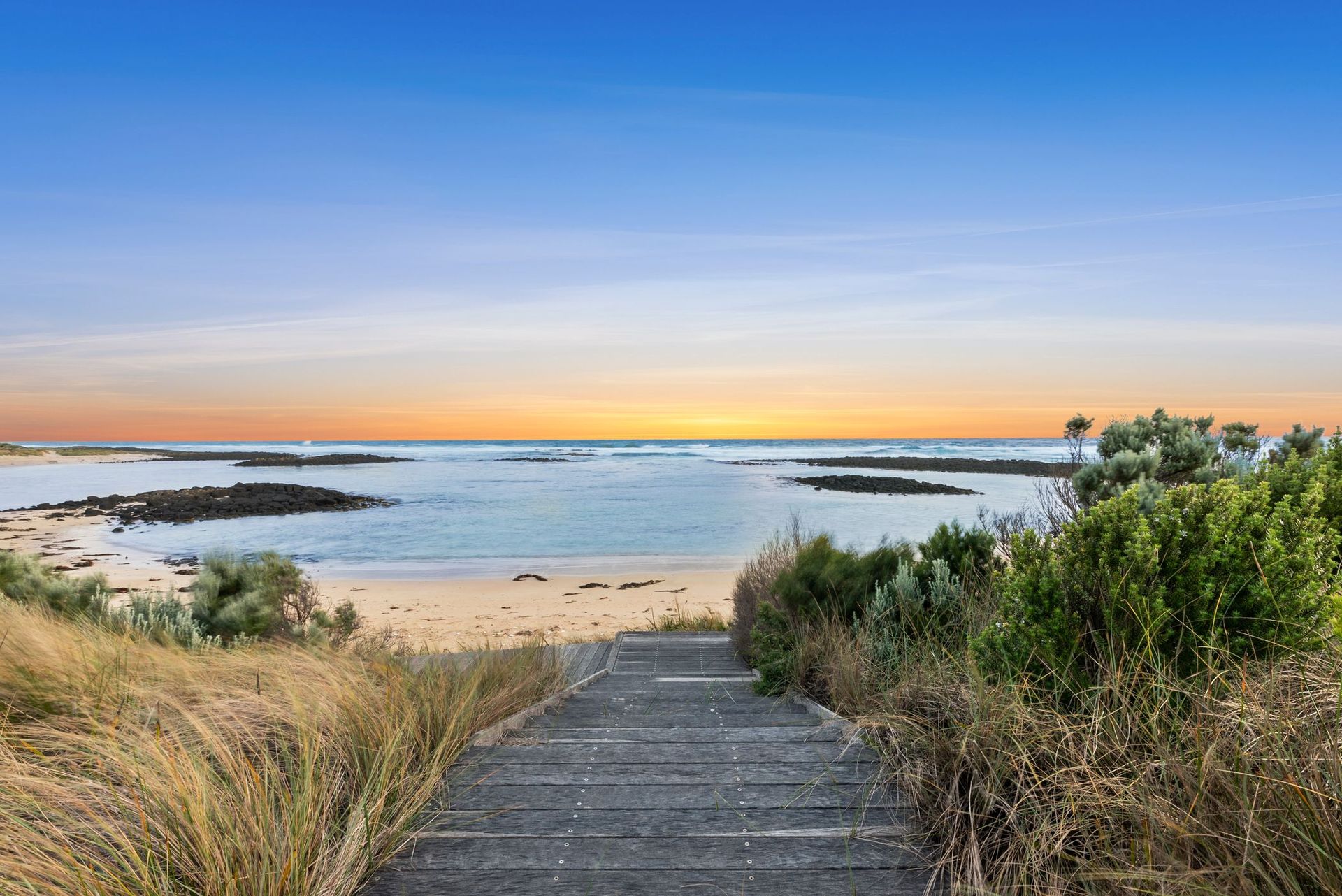 The unique design envelops a sun-drenched central courtyard and curved entertaining deck, perfectly placed to showcase the sweeping Southern Ocean vista. The dynamic scene can also be viewed from the primary living zone, the contemporary kitchen and the grand master suite, and celebrates the region's rugged beauty. Enjoy direct beach access via a private boardwalk meandering through the native garden to the shoreline.